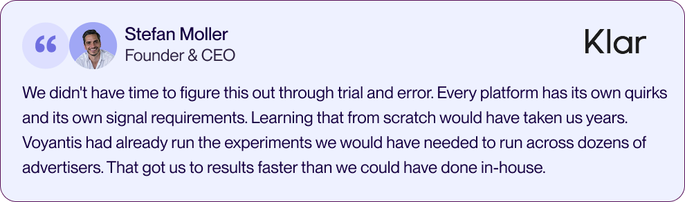 This is why even teams with strong data science practices hit a wall. Semrush already had a five-year LTV model running when they approached Voyantis. It was solid and sophisticated, but it had been built for forecasting, not activation. Every user at the same funnel stage got the same value signal. What they needed was user-level predictions inside Google within days of acquisition, not batch analyses on historical cohorts.