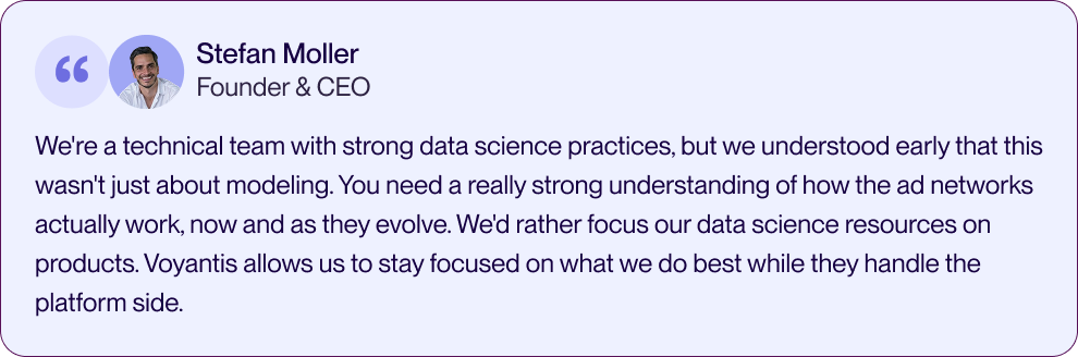 We didn't have time to figure this out through trial and error. Every platform has its own quirks and its own signal requirements. Learning that from scratch would have taken us years. Voyantis had already run the experiments we would have needed to run, across dozens of advertisers. That got us to results faster than we could have done in-house.